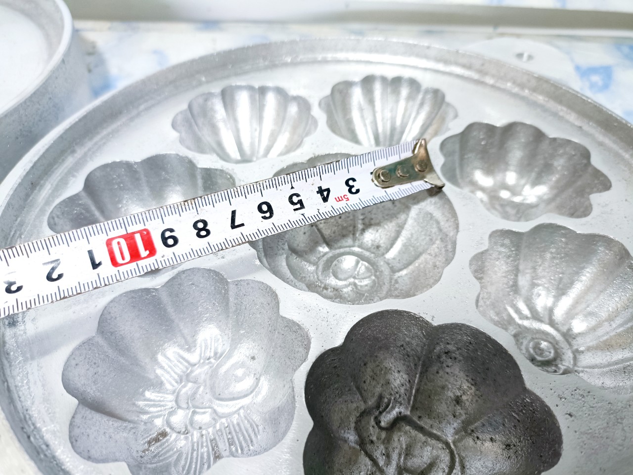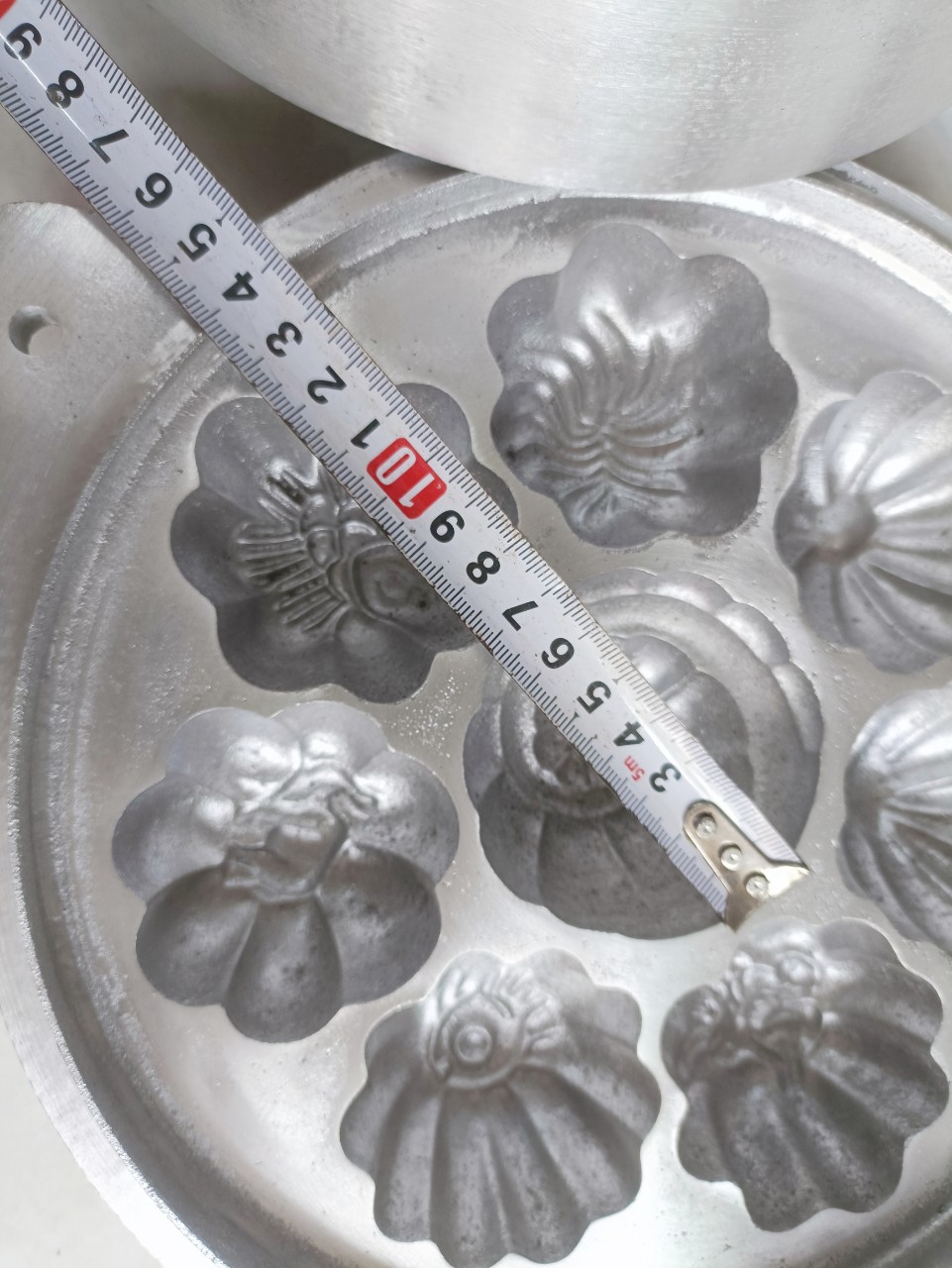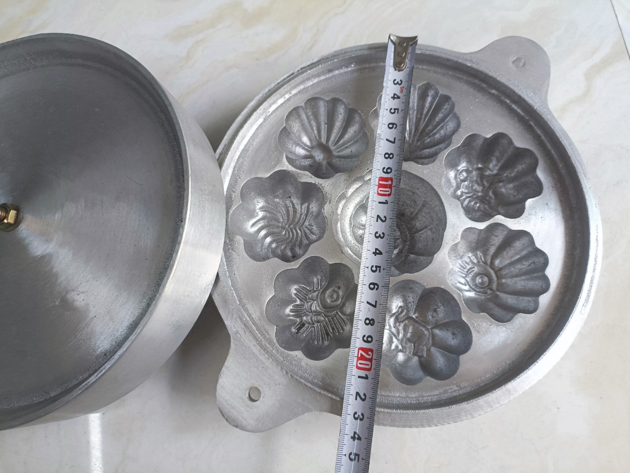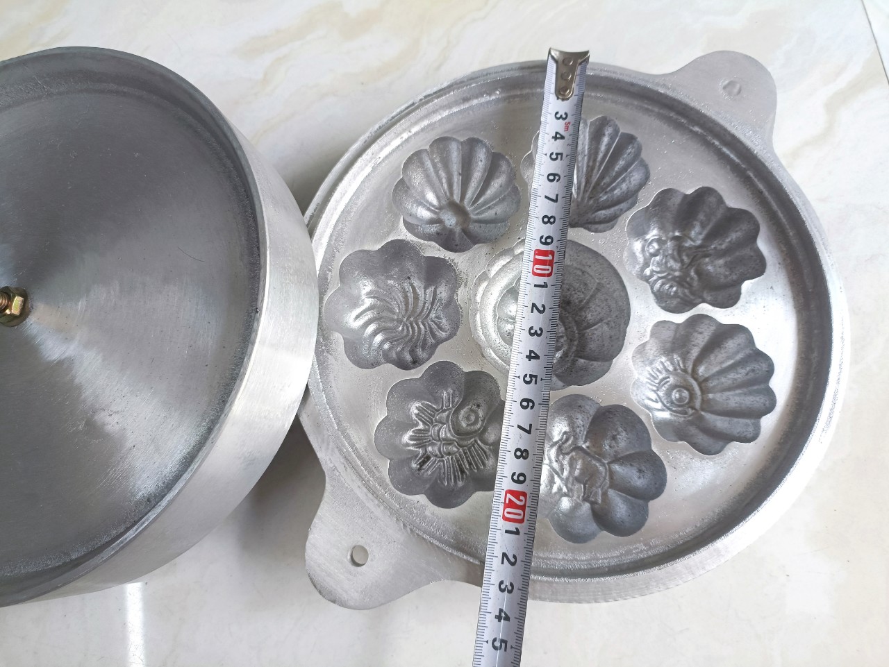 Chất liệu: Nhôm Nguyên khối KHUÔN 8 BÁNH ĐƯỜNG KÍNH KHUÔN: 23,5CM, CAO :8,5CM ĐƯỜNG KÍNH BÁNH: 7CM, ĐỘ SÂU BÁNH 2,5CM BÁNH RA TO BỰ( BẰNG CÁI CHÉN NƯỚC MẮN 7CM)